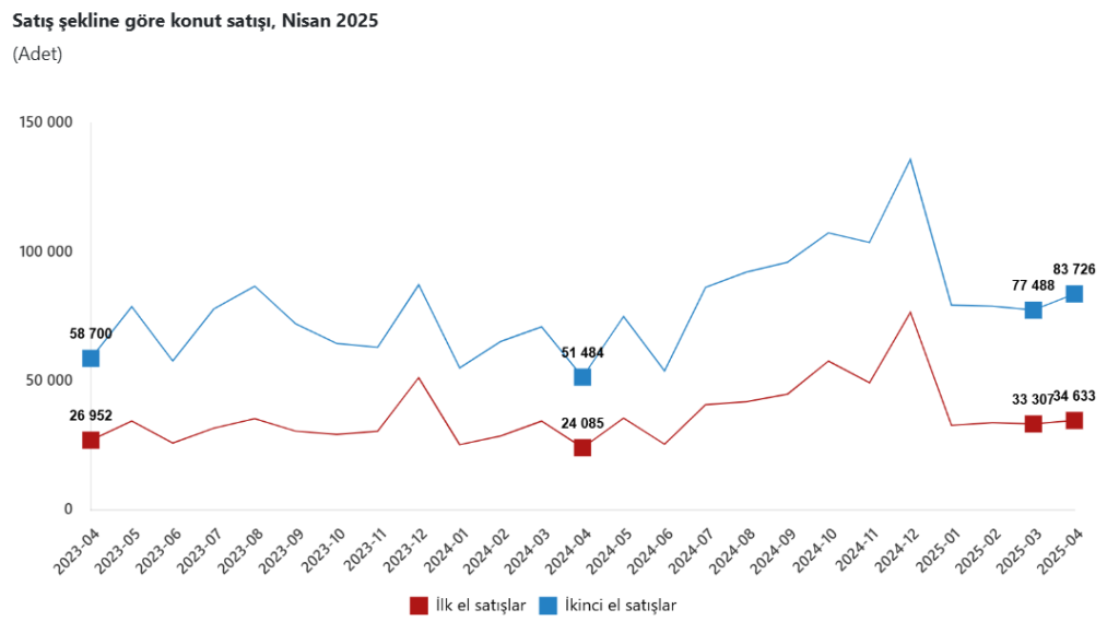Türkiye genelinde ikinci el konut satış sayısı Nisan ayında bir önceki yılın aynı ayına göre %62,6 oranında artarak 83 bin 726 oldu. Toplam konut satışları içinde ikinci el konut satışının payı %70,7 oldu. İkinci el konut satışları Ocak-Nisan döneminde ise bir önceki yılın aynı dönemine göre %31,6 oranında artarak 319 bin 636 olarak gerçekleşti.