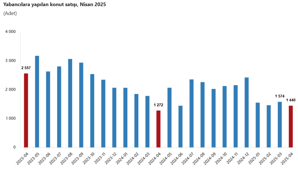 Yabancılara yapılan konut satışları Nisan ayında bir önceki yılın aynı ayına göre %13,2 oranında artarak bin 440 oldu. Nisan ayında toplam konut satışları içinde yabancılara yapılan konut satışının payı %1,2 olarak gerçekleşti. Yabancılara yapılan konut satış sayısının en fazla olduğu iller sırasıyla 529 ile İstanbul, 497 ile Antalya ve 117 ile Mersin oldu.