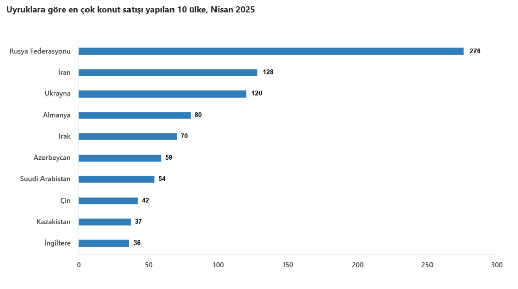 Nisan ayında ülke uyruklarına göre en fazla konut satışı sırasıyla 276 ile Rusya Federasyonu, 128 ile İran ve 120 ile Ukrayna vatandaşlarına yapıldı.