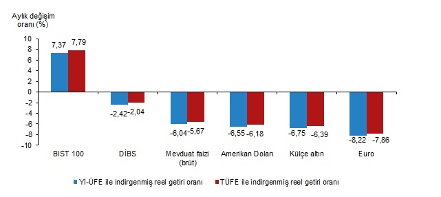 Yİ-ÜFE ile indirgendiğinde; yatırım araçlarından Devlet İç Borçlanma Senetleri (DİBS) %2,42, mevduat faizi (brüt) %6,04, Amerikan doları %6,55, külçe altın %6,75 ve Euro %8,22 oranlarında yatırımcısına kaybettirdi. TÜFE ile indirgendiğinde DİBS %2,04, mevduat faizi (brüt) %5,67, Amerikan doları %6,18, külçe altın %6,39 ve Euro %7,86 oranlarında yatırımcısına kaybettirdi.