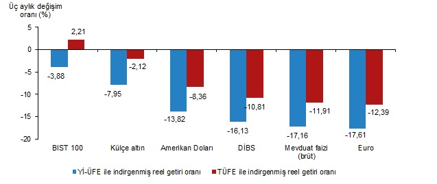 BIST 100 endeksi, üç aylık değerlendirmede; TÜFE ile indirgendiğinde %2,21 oranında yatırımcısına en yüksek reel getiri sağlarken; Yİ-ÜFE ile indirgendiğinde ise %3,88 oranında yatırımcısına kaybettirmiştir. Euro, Yİ-ÜFE ile indirgendiğinde %17,61, TÜFE ile indirgendiğinde ise %12,39 oranında yatırımcısına en çok kaybettiren yatırım aracı oldu.