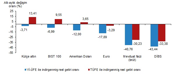 Altı aylık değerlendirmeye göre külçe altın; TÜFE ile indirgendiğinde %13,41 oranında yatırımcısına en yüksek reel getiri sağlarken; Yİ-ÜFE ile indirgendiğinde ise %3,71 oranında yatırımcısına kaybettirdi. Aynı dönemde DİBS, Yİ-ÜFE ile indirgendiğinde %43,44, TÜFE ile indirgendiğinde ise %33,38 oranında yatırımcısına en çok kaybettiren yatırım aracı oldu.