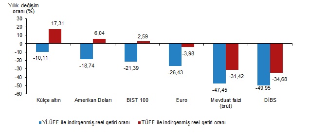 Yıllık değerlendirmede, Yİ-ÜFE ile indirgendiğinde; yatırım araçlarından Amerikan doları %18,74, BIST 100 endeksi %21,39, Euro %26,43, mevduat faizi (brüt) %47,45 ve DİBS %49,95 oranlarında yatırımcısına kaybettirdi. TÜFE ile indirgendiğinde ise Amerikan doları %6,04 ve BIST 100 endeksi %2,59 oranlarında yatırımcısına kazandırırken; Euro %3,98, mevduat faizi (brüt) %31,42 ve DİBS %34,68 oranlarında yatırımcısına kaybettirdi.