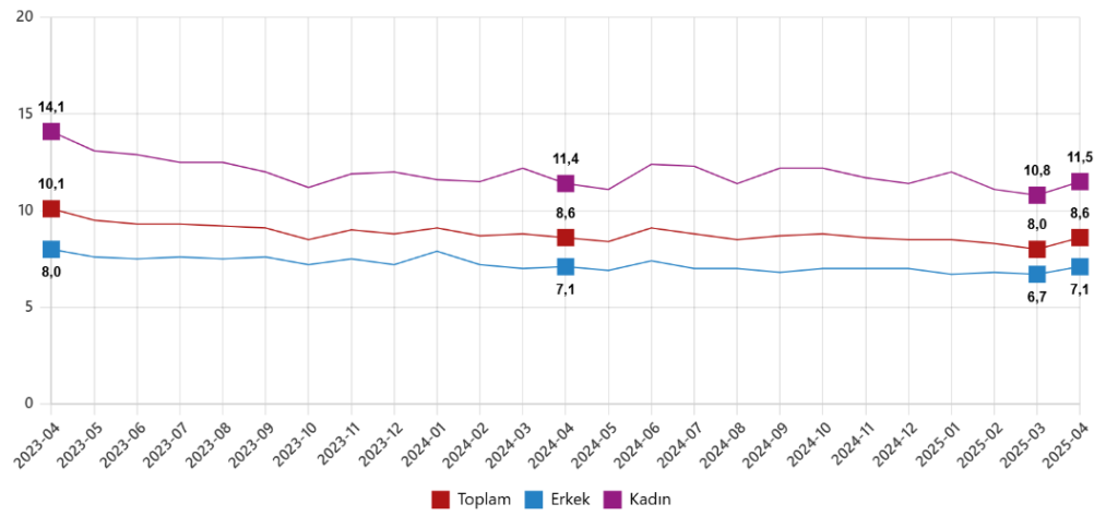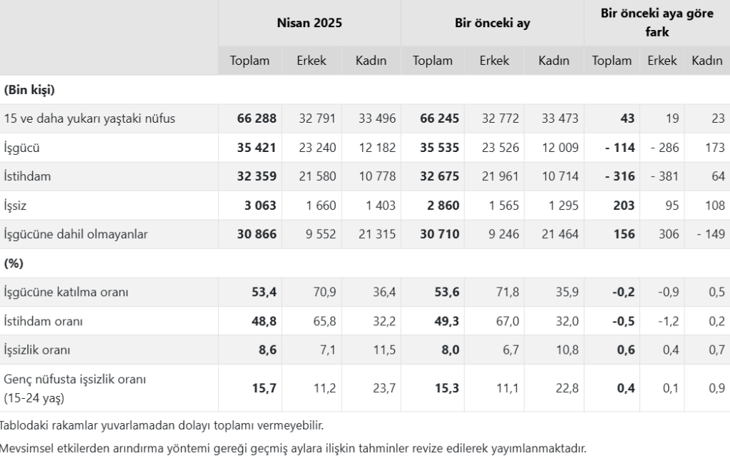 Hanehalkı İşgücü Araştırması sonuçlarına göre; 15 ve daha yukarı yaştaki kişilerde işsiz sayısı 2025 yılı Nisan ayında bir önceki aya göre 203 bin kişi artarak 3 milyon 63 bin kişi oldu. İşsizlik oranı ise 0,6 puan artarak %8,6 seviyesinde gerçekleşti. İşsizlik oranı erkeklerde %7,1 iken kadınlarda %11,5 olarak tahmin edildi.