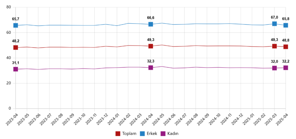 İstihdam edilenlerin sayısı 2025 yılı Nisan ayında bir önceki aya göre 316 bin kişi azalarak 32 milyon 359 bin kişi, istihdam oranı ise 0,5 puan azalarak %48,8 oldu. Bu oran erkeklerde %65,8 iken kadınlarda %32,2 olarak gerçekleşti.