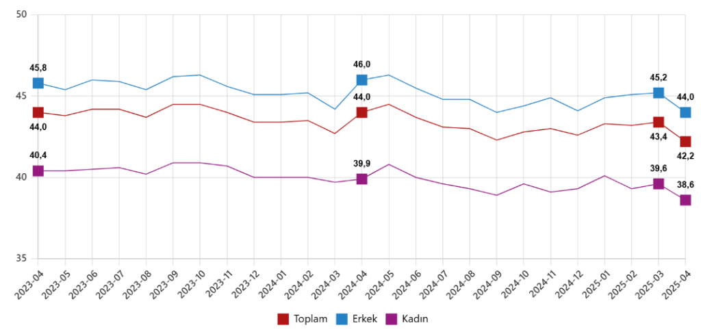 İstihdam edilenlerden referans döneminde işbaşında olanların, mevsim ve takvim etkilerinden arındırılmış haftalık ortalama fiili çalışma süresi 2025 yılı Nisan ayında bir önceki aya göre 1,2 saat azalarak 42,2 saat olarak gerçekleşti.