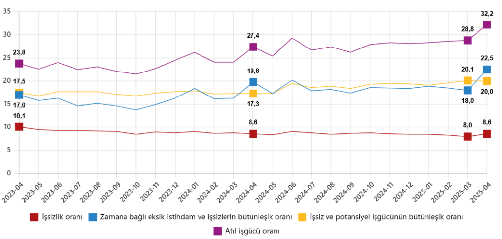Türkiye İstatistik Kurumu (TÜİK) Nisan 2025 itibarıyla İşgücü İstatistiklerini açıkladı. Buna göre, mevsim etkisinden arındırılmış işsizlik oranı yüzde 8.6 seviyesinde gerçekleşti.