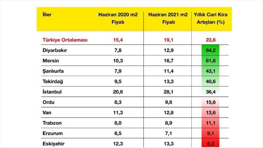 Kiralık konut piyasasında yaşanan yoğun talep ile birlikte; Türkiye genelinde ortalama kiralık konut ilan metrekare fiyatındaki yıllık artış oranı Haziran ayında yüzde 23,6 olurken, ortalama kiralık konut ilan metrekare fiyatı 19,1 TL’ye yükseldi. Yıllık kira artış oranı üç büyük ilden İstanbul’da yüzde 36,4 gerçekleşerek, yüzde 23,2 ile Ankara’yı ve yüzde 22,2 ile İzmir’i geride bıraktı. Buna göre kiralık konut ilan metrekare fiyatları geçen yıl aynı aya göre artış göstererek, İstanbul’da 28,1 TL’ye, Ankara’da 14,2 TL’ye ve İzmir’de 20 TL’ye yükseldi. Haziran’da en yüksek yıllık kira artışı yüzde 64,2 ile Diyarbakır’da, yüzde 61,8 ile Mersin’de, yüzde 43,1 ile Şanlıurfa’da, yüzde 40,6 ile Tekirdağ’da ve yüzde 36,4 ile İstanbul’da kaydedildi.