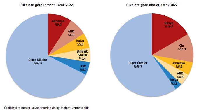 İthalatta Rusya Federasyonu ilk sırayı aldı. Ocak ayında Rusya Federasyonu’ndan yapılan ithalat 4 milyar 637 milyon dolar olurken, bu ülkeyi sırasıyla; 3 milyar 95 milyon dolar ile Çin, 1 milyar 440 milyon dolar ile Almanya, 1 milyar 279 milyon dolar ile ABD, 769 milyon dolar ile İtalya izledi. İlk 5 ülkeden yapılan ithalat, toplam ithalatın %40,3’ünü oluşturdu.