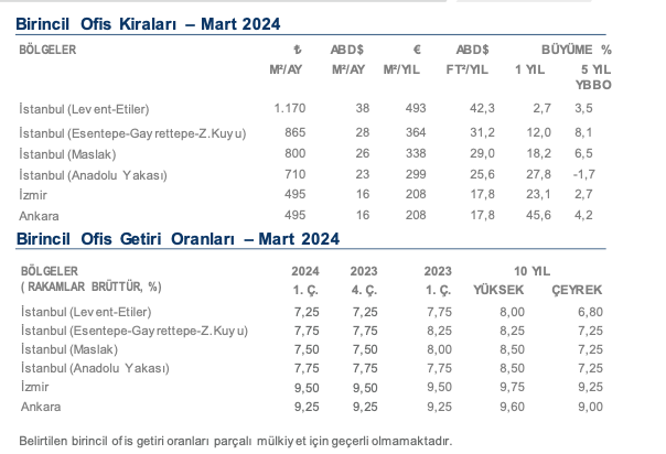 - Ofis birincil kiralarındaki artış 2024 yılının ilk çeyreğinde de yükselişini sürdürmüştür. Dolar bazında geçen yılın ilk çeyreğine kıyasla %2,7 artış gösteren birincil kiralara ek olarak, ülke genelindeki birincil kira ortalaması %10,29 artış göstermiştir. Yüksek talep karşısında ofis arzının kısıtlı olması, birincil kiralardaki yukarı yönlü baskıyı sürdürmektedir.
