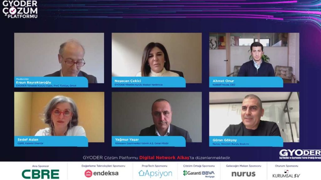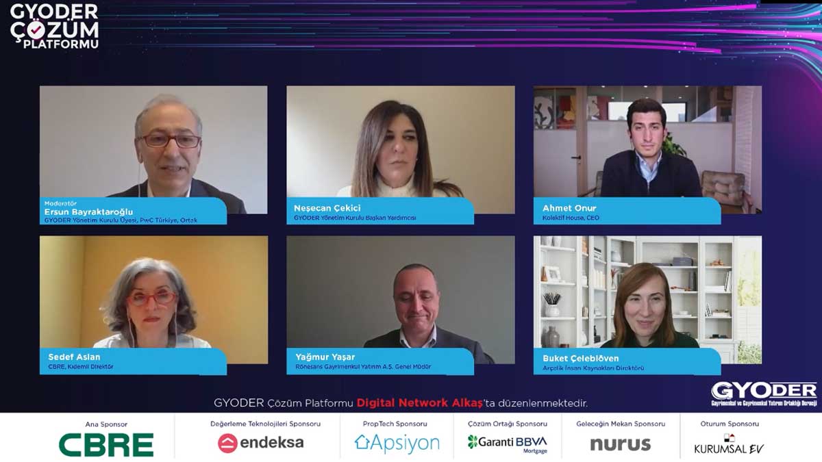 GYODER (Gayrimenkul ve Gayrimenkul Yatırım Ortaklığı Derneği) tarafından, gayrimenkul sektöründe yaşanan son gelişmeleri değerlendirmek ve yaşanan sorunlara çözüm bulmak amacıyla hayata geçirilen ‘GYODER Çözüm Platformu’ toplantısı, Digital Network Alkaş’ta üçüncü kez online platformda yapıldı. CBRE Türkiye’nin ana sponsorluğu, Endeksa’nın değerleme teknolojileri sponsorluğu, Apsiyon’un proptech sponsorluğu, Garanti BBVA’nın çözüm ortağı sponsorluğu, Nurus’un geleceğin mekan sponsoru ve Kurumsal Ev’in oturum sponsorluğu ile 30 Mart Salı günü ‘Şimdi Her Yer Ofis’ başlığı altında düzenlenen toplantıya gayrimenkul sektörü temsilcilerinin ilgisi yüksek oldu. Moderatörlüğünü GYODER Yönetim Kurulu Üyesi, PwC Türkiye Ortağı Ersun Bayraktaroğlu’nun yaptığı ‘Çözüm Platformu’ toplantısının konuşmacıları, ofis alanlarında pandeminin de etkisiyle hızlanan değişimi konuştu.