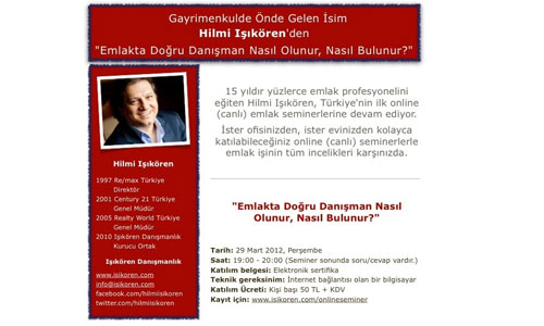 "Emlakta Doğru Danışman Nasıl Olunur, Nasıl Bulunur?" isimli dördüncü online (canlı) emlak semineri 29 Mart, Perşembe günü 19:00 – 20:00 saatleri arasında canlı olarak internet üzerinden gerçekleştirilecek. Kişi başı katılım bedeli 50 TL + KDV olan online (canlı) emlak seminerine kayıt ve detaylı bilgi için www.isikoren.com adresini ziyaret edebilirsiniz.