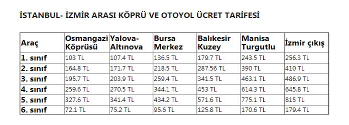 Araç sınıfları bazında Osmangazi Köprüsü’nden geçiş ücretleri ve belli merkezlerden çıkacak şekilde otoyol ücretleri aşağıdaki tabloda özetlendiği gibidir. Burada 1. sınıf araçların Osmangazi Köprüsü’nden geçerek hiç otoyoldan çıkmadan İzmir’e varış ücretleri köprü ücreti dahil olacak şekilde 256.3 TL’dir.