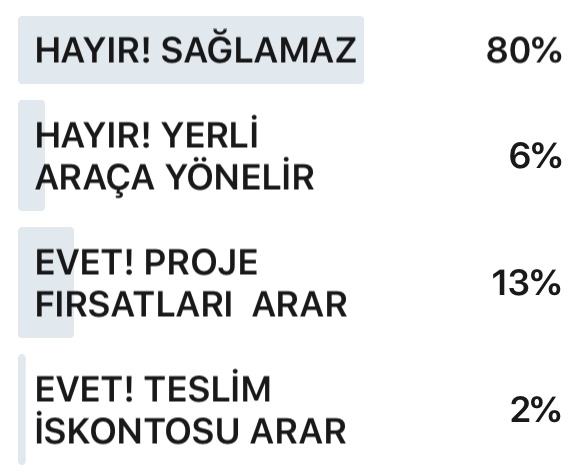 Emlakdream’e özel LinkedIn aracığı ile düzenlediğim anket yatırımcı davranışında radikal değişikliklerin olmayacağını gösterirken; yerli otomobil pazarına çok düşük oranda yönelim ile birlikte % 15’lik gayrimenkul pazarına yönelim izleme olasılığının olabileceğini öngörebilmektedir.
