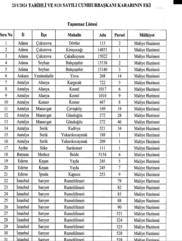Resmi Gazete’de yayımlanan Cumhurbaşkanlığı kararıyla mülkiyeti Maliye Hazinesi Türkiye Elektrik Dağıtım Anonim Şirketi (TEDAŞ) ve Türkiye Elektrik İletim Anonim Şirketi’ne (TEİAŞ) kayıtlı olan 12 ildeki 73 taşınmaz özelleştirme kapsamına alınmıştı. Antalya, Muğla Marmaris, Mersin ve İstanbul’da özelleştirme kapsamında alınan 7 arazi arazinin denize sıfır konumda olması dikkat çekti.