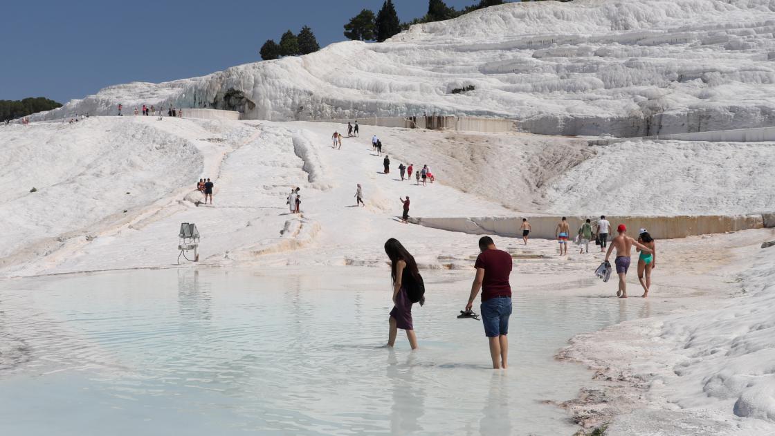 Yeni normalleşme sürecinin ardından 1 Haziran’da kapılarını açan Pamukkale, yerli ve yabancı turistleri ağırlamaya devam ediyor.