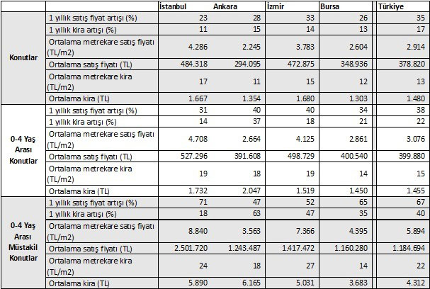 Yapılan çalışmaya göre Türkiye genelinde konut satış fiyatları son 1 yılda %35, kira ise bedeli ise %17 artış gösterdi. Aralık sonu rakamlarına göre Türkiye genelinde ortalama konut satış fiyatı 378 bin 820 TL, ortalama kira 1.480 TL oldu.