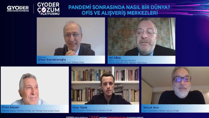 Açılış konuşmasını GYODER Başkanı Mehmet Kalyoncu’nunyaptığı ‘Çözüm Platformu’ toplantısının konuşmacıları, pandemi sürecinde ofis ve AVM’lerde yaşanan değişimi konuştu.Online toplantının konuşmacıları; (konuşma sırasına göre) IPSOS Türkiye CCO’su Yasemin Özen Gürelli,Gazi Üniversitesi Tıp Fakültesi Dekanı, Sağlık Bakanlığı Bilim Kurulu Üyesi Prof. Dr. Mustafa Necmi İlhan,Migros Ticaret A.Ş. E-Ticaret İş Birimi Direktörü Orçun Onat,DeFacto Operasyon ve Genişlemeden Sorumlu Genel Müdür Yardımcısı Serdar Ersoy, FİBA Commercial Properties Yönetim Kurulu Üyesi ve CEO’su Yurdaer Kahraman, GYODER İcra Kurulu Üyesi, Sinpaş GYO Genel Müdürü Seba Gacemer, Alkaş Yönetim Kurulu Başkanı, AYD Başkan Yardımcısı Avi Alkaş, Pamir&Soyuer Yönetici Ortağı, ULI Türkiye İcra Kurulu Üyesi Firuz Soyuer, Avcı Architects Kurucu Ortağı Mimar Selçuk Avcı, Yirmibirgram Marka Ajansı Kurucu Ortağı Onur Yanık, Gayrimenkul Hukuku Enstitüsü Başkanı Avukat Ali Yüksel, Aareal Bank Türkiye Genel Müdürü Buket Hayretçi oldu.