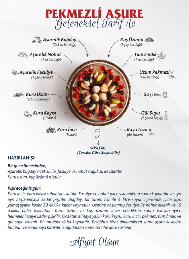 1 gece öncesinden: Aşurelik buğday sıcak su ile, fasulye ve nohut soğuk su ile ıslatılır. Kuru üzüm ve kuş üzümü ıslatılır.