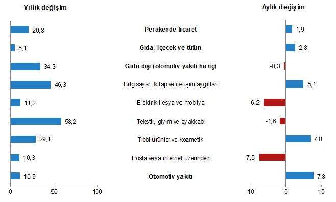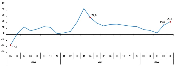 Sabit fiyatlarla perakende satış hacmi (2015=100) 2022 yılı Mayıs ayında bir önceki yılın aynı ayına göre %20,8 arttı. Aynı ayda gıda, içecek ve tütün satışları %5,1, gıda dışı satışlar (otomotiv yakıtı hariç) %34,3, otomotiv yakıtı satışları ise %10,9 arttı.