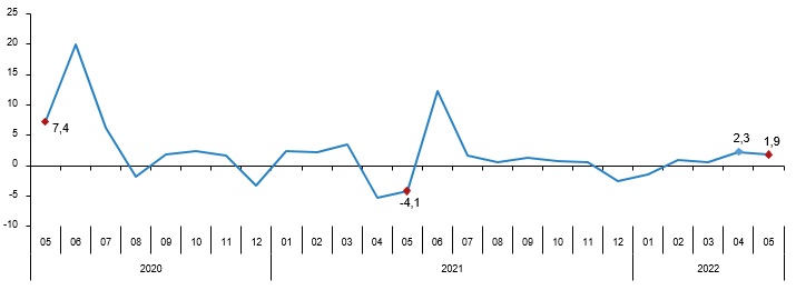 Sabit fiyatlarla perakende satış hacmi (2015=100) 2022 yılı Mayıs ayında bir önceki aya göre %1,9 arttı. Aynı ayda gıda, içecek ve tütün satışları %2,8 arttı, gıda dışı satışlar (otomotiv yakıtı hariç) %0,3 azaldı, otomotiv yakıtı satışları ise %7,8 arttı.