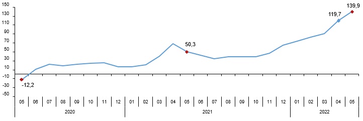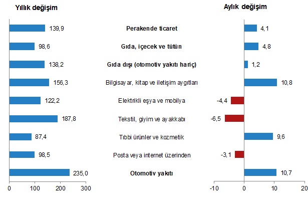 Cari fiyatlarla perakende ciro (2015=100) 2022 yılı Mayıs ayında bir önceki yılın aynı ayına göre %139,9 arttı. Aynı ayda gıda, içecek ve tütün satışları %98,6, gıda dışı satışlar (otomotiv yakıtı hariç) %138,2, otomotiv yakıtı satışları ise %235,0 arttı.
