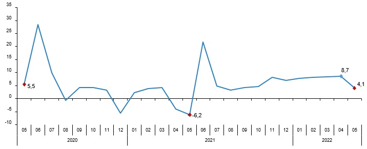 Cari fiyatlarla perakende ciro (2015=100) 2022 yılı Mayıs ayında bir önceki aya göre %4,1 arttı. Aynı ayda gıda, içecek ve tütün satışları %4,8, gıda dışı satışlar (otomotiv yakıtı hariç) %1,2, otomotiv yakıtı satışları ise %10,7 arttı.
