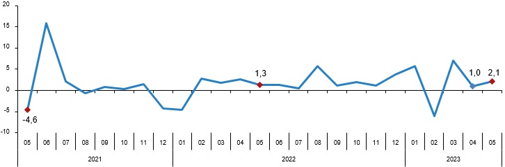 Sabit fiyatlarla perakende satış hacmi (2015=100) 2023 yılı Mayıs ayında bir önceki aya göre %2,1 arttı. Aynı ayda gıda, içecek ve tütün satışları %2,5, gıda dışı satışlar (otomotiv yakıtı hariç) %2,0, otomotiv yakıtı satışları ise %2,2 arttı.