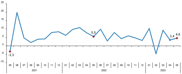 Cari fiyatlarla perakende ciro (2015=100) 2023 yılı Mayıs ayında bir önceki aya göre %4,6 arttı. Aynı ayda gıda, içecek ve tütün satışları %5,5, gıda dışı satışlar (otomotiv yakıtı hariç) %5,5 arttı, otomotiv yakıtı satışları ise %0,9 azaldı.