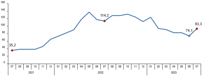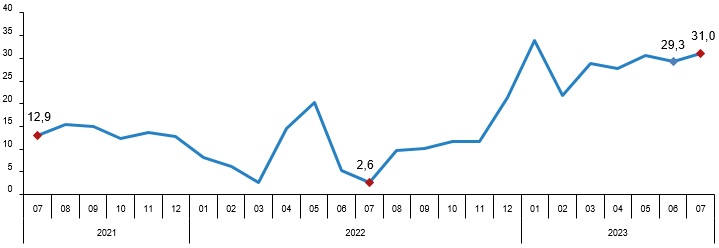 Sabit fiyatlarla perakende satış hacmi (2015=100) 2023 yılı Temmuz ayında bir önceki yılın aynı ayına göre %31,0 arttı. Aynı ayda gıda, içecek ve tütün satışları %19,1, gıda dışı satışlar (otomotiv yakıtı hariç) %41,8, otomotiv yakıtı satışları ise %17,0 arttı.