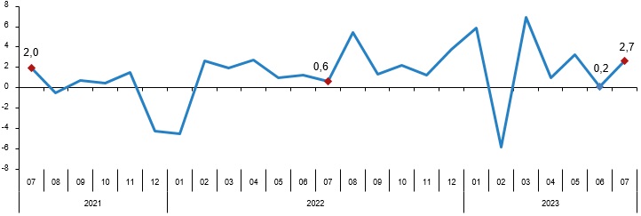 Sabit fiyatlarla perakende satış hacmi (2015=100) 2023 yılı Temmuz ayında bir önceki aya göre %2,7 arttı. Aynı ayda gıda, içecek ve tütün satışları %2,4 azaldı, gıda dışı satışlar (otomotiv yakıtı hariç) %5,9 arttı, otomotiv yakıtı satışları ise %1,0 azaldı.