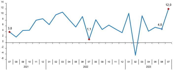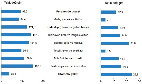 Cari fiyatlarla perakende ciro (2015=100) 2023 yılı Temmuz ayında bir önceki aya göre %12,0 arttı. Aynı ayda gıda, içecek ve tütün satışları %3,7, gıda dışı satışlar (otomotiv yakıtı hariç) %13,5, otomotiv yakıtı satışları ise %23,9 arttı.