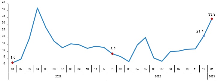 Perakende satış hacmi aylık değişim oranı (%), Ocak 2023
