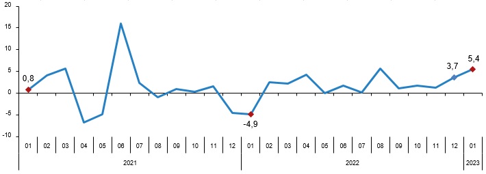 Sabit fiyatlarla perakende satış hacmi (2015=100) 2023 yılı Ocak ayında bir önceki aya göre %5,4 arttı. Aynı ayda gıda, içecek ve tütün satışları %7,4, gıda dışı satışlar (otomotiv yakıtı hariç) %5,6, otomotiv yakıtı satışları ise %2,1 arttı.