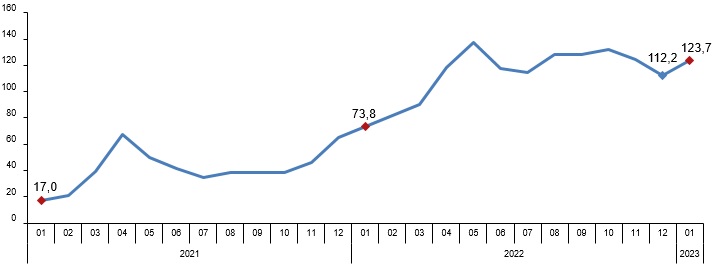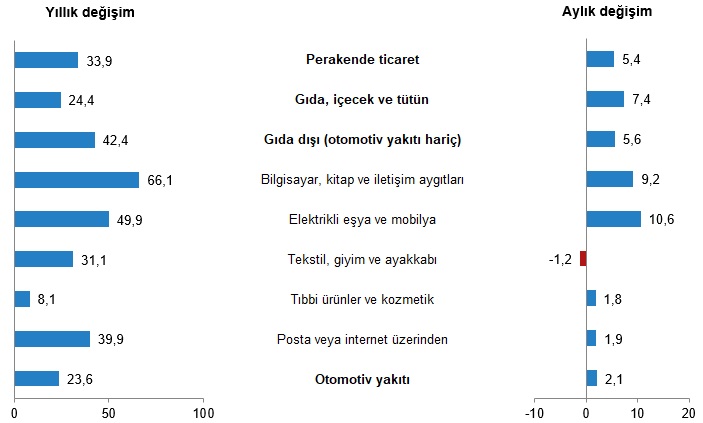 Sabit fiyatlarla perakende satış hacmi (2015=100) 2023 yılı Ocak ayında bir önceki yılın aynı ayına göre %33,9 arttı. Aynı ayda gıda, içecek ve tütün satışları %24,4, gıda dışı satışlar (otomotiv yakıtı hariç) %42,4, otomotiv yakıtı satışları ise %23,6 arttı.