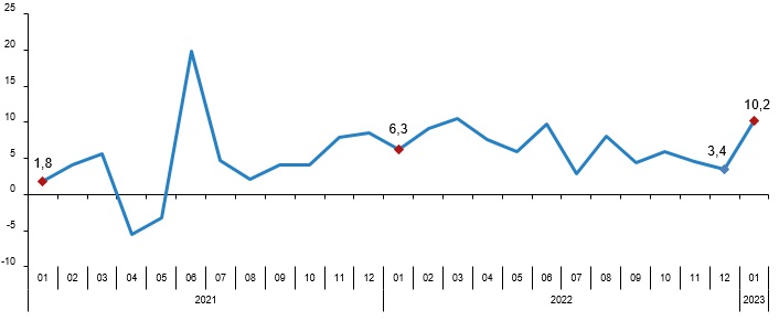 Cari fiyatlarla perakende ciro (2015=100) 2023 yılı Ocak ayında bir önceki aya göre %10,2 arttı. Aynı ayda gıda, içecek ve tütün satışları %9,8, gıda dışı satışlar (otomotiv yakıtı hariç) %12,3, otomotiv yakıtı satışları ise %4,0 arttı.