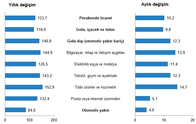 Cari fiyatlarla perakende ciro (2015=100) 2023 yılı Ocak ayında bir önceki yılın aynı ayına göre %123,7 arttı. Aynı ayda gıda, içecek ve tütün satışları %118,6, gıda dışı satışlar (otomotiv yakıtı hariç) %140,8, otomotiv yakıtı satışları ise %84,6 arttı.