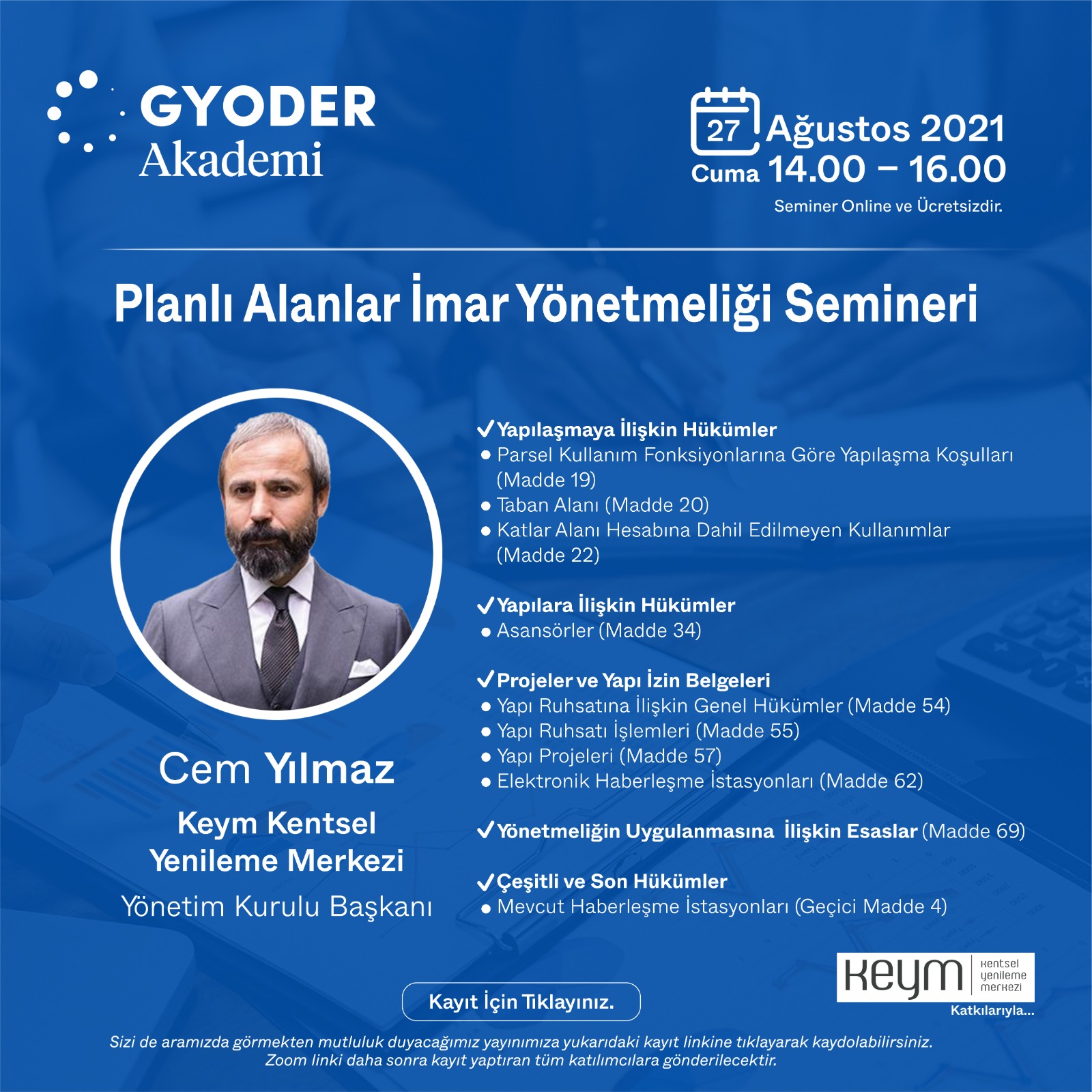 GYODER Akademi tarafından 27 ağustos cuma günü 14.00-16.00 saatleri arasında online olarak gerçekleştirilecek olan ve katılımın ücretsiz olduğu “Planlı Alanlar İmar Yönetmeliği” seminerini Keym Kentsel Yenileme Merkezi Yönetim Kurulu Başkanı Cem Yılmaz verecek.