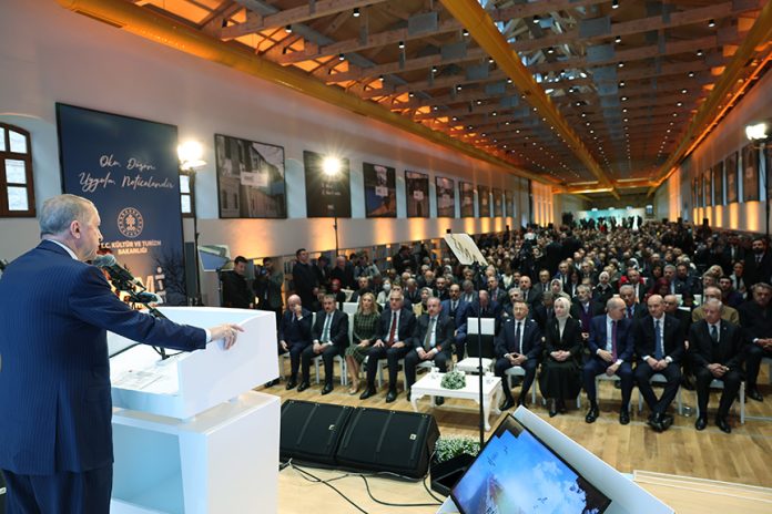 Milli Saraylar Başkanlığını, Cumhurbaşkanlığına bağlayarak, ecdat yadigarı pek çok eserin ihyasını sağladıklarını, bunlarla beraber Taksim’deki Atatürk Kültür Merkezi’ni yürütülen tüm olumsuz kampanyalara rağmen yeniden ve çok daha güzel bir şekilde İstanbul’un kültür sanat hayatına kazandırdıklarını aktaran Erdoğan, şöyle devam etti: