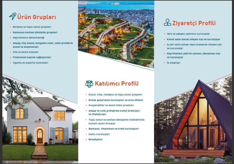 Villa, Konut, Rezidans ve Toplu Konut Projeleri, AVM İş Merkezleri ve Plazalar, Sanayi Siteleri ve Organize Sanayi Bölgeleri, Emlak Pazarlama Kuruluşları ve Arsa Ofisleri, Kooperatifler ve Devremülk Şirketleri, Ahşap ve Çelik Prefabrike Konut Üreticileri ve İthalatçıları, Toplu Konut ve Kentsel Dönüşüme Müteahhitlik Hizmeti Veren Firmalar, Bankalar, Finansman ve Kredi Kuruluşları, Kamu Kuruluşları, Belediyeler, Profesyonel Bina Yönetim Şirketleri, Sektör STK’ları, Sektörel Yayın Kuruluşları