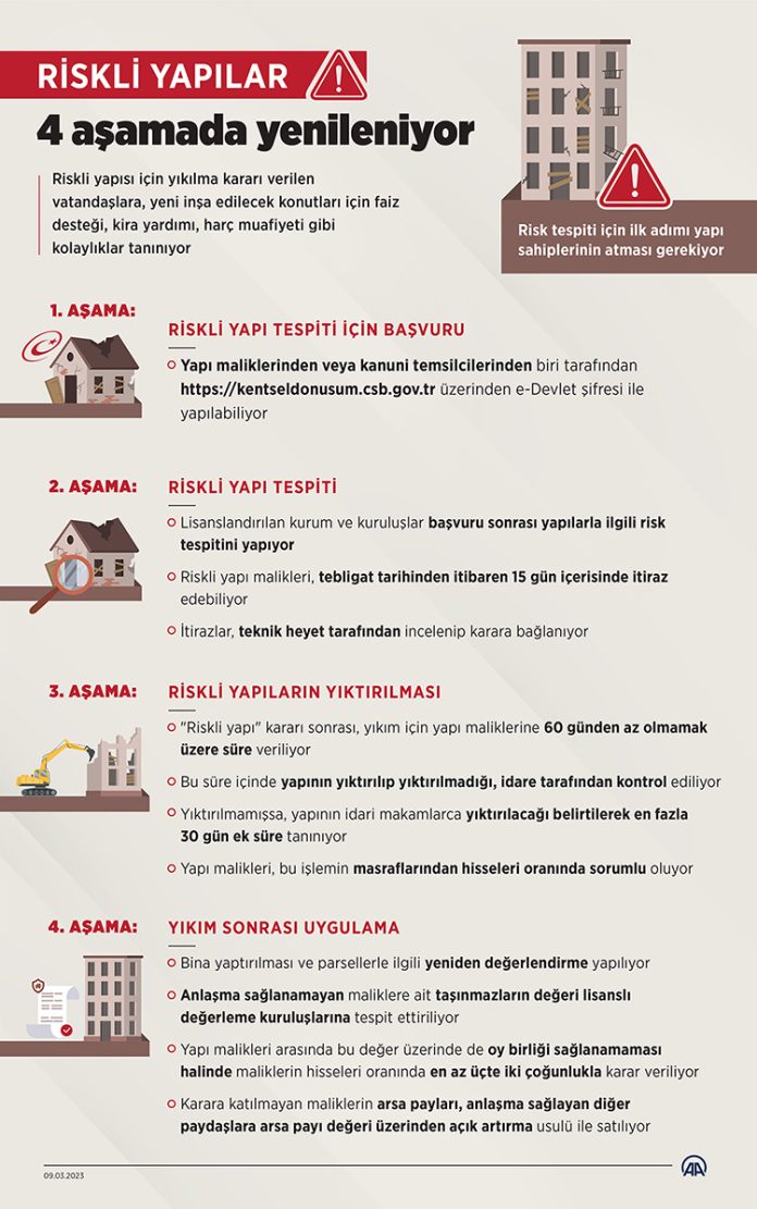 Riskli yapıların yıkılarak yenisinin yapılmasıyla ilgili dönüşüm süreci ise yapı sahiplerinin “tespit başvurusu” ile başlıyor, “risk tespiti“, “riskli yapıların yıktırılması“yla devam ediyor ve “yıkım sonrası uygulama“yla sonlanıyor.