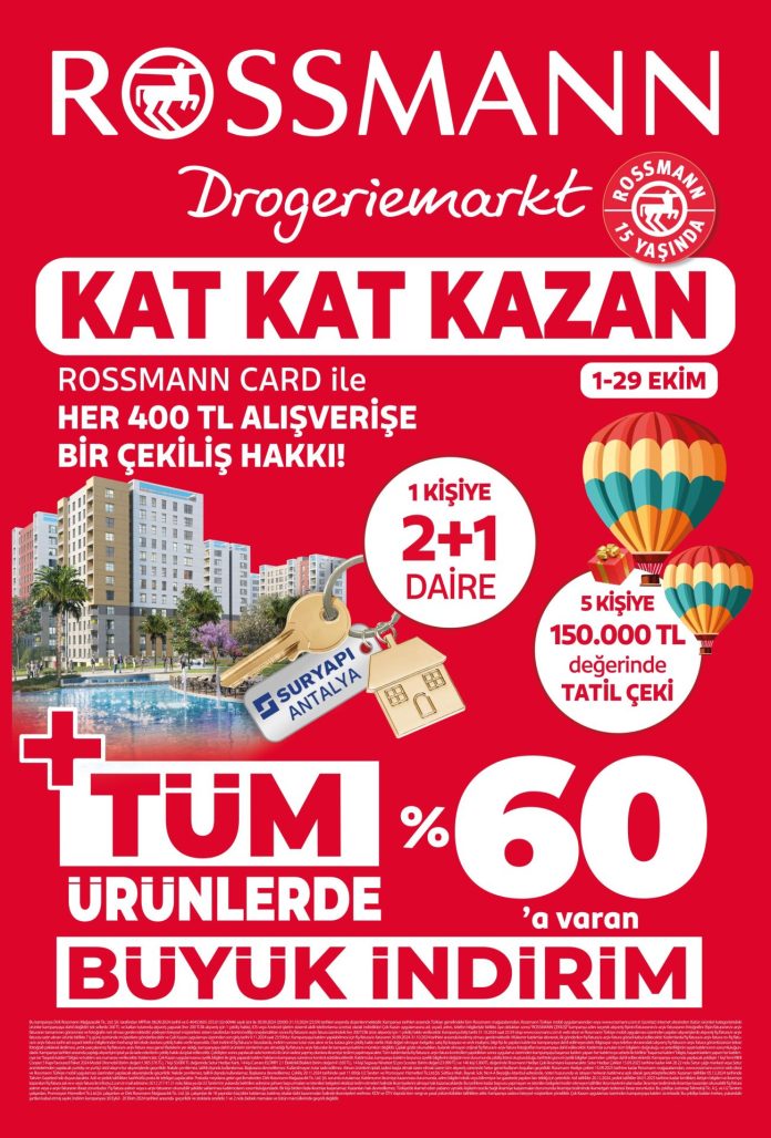 Türkiye’deki 15’inci yılını kutlayan Rossmann’ın, 1–29 Ekim 2025 tarihleri arasında geçerli olacak “Kat Kat Kazan” çekiliş kampanyası kapsamında; tüm ürünlerde %60’a varan indirimler uygulanacak. Ayrıca Rossmann Kart sahiplerine Rossmann mağazaları ile online satış platformlarında yapacakları her 400 TL’lik alışveriş harcamasına 1 adet çekiliş hakkı verilecek.