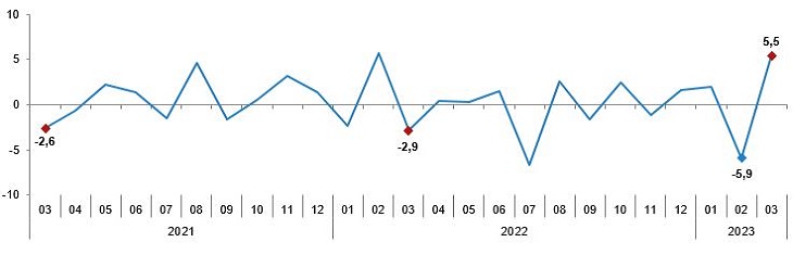 Sanayi üretim endeksi aylık değişim oranları (%), Mart 2023