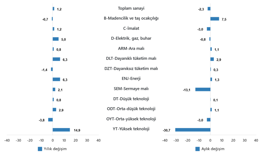 Sanayinin alt sektörleri incelendiğinde, 2025 yılı Ocak ayında madencilik ve taş ocakçılığı sektörü endeksi bir önceki aya göre %7,5 arttı, imalat sanayi sektörü endeksi %3,0 azaldı ve elektrik, gaz, buhar ve iklimlendirme üretimi ve dağıtımı sektörü endeksi %0,8 azaldı.