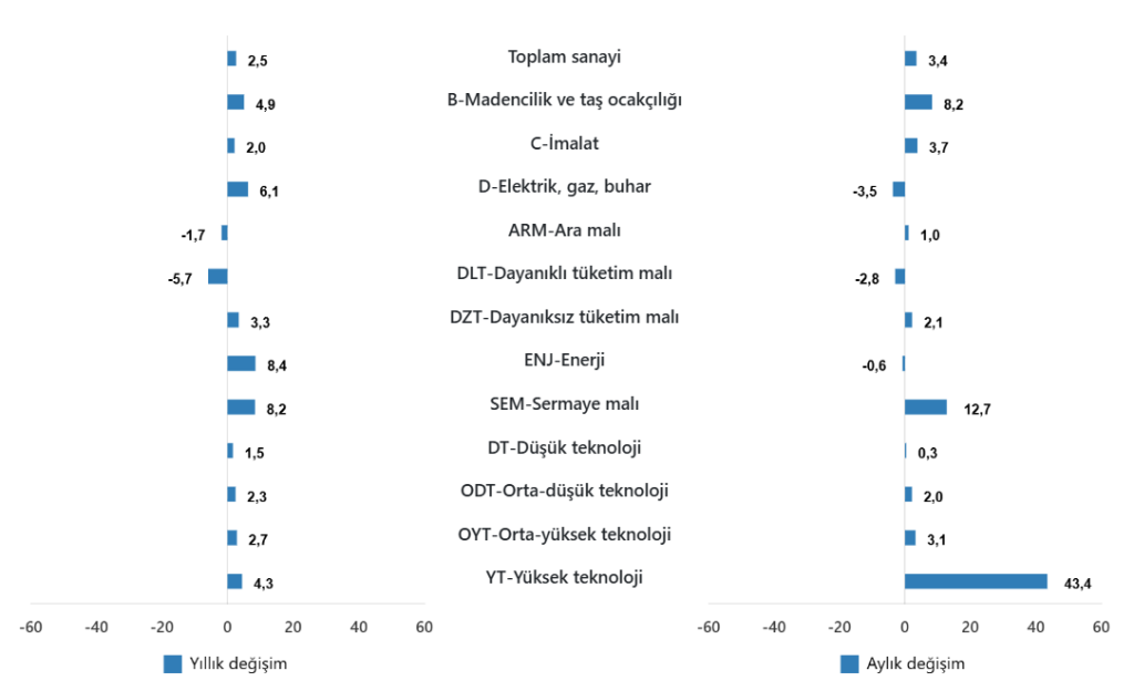 Sanayinin alt sektörleri incelendiğinde, 2025 yılı Mart ayında madencilik ve taş ocakçılığı sektörü endeksi bir önceki aya göre %8,2 arttı, imalat sanayi sektörü endeksi %3,7 arttı ve elektrik, gaz, buhar ve iklimlendirme üretimi ve dağıtımı sektörü endeksi %3,5 azaldı.