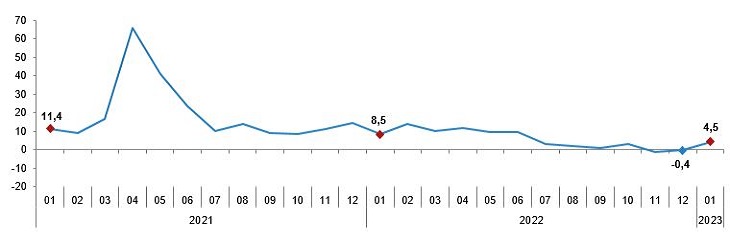 Türkiye İstatistik Kurumu (TÜİK), Ocak 2023 itibarıyla Sanayi Üretim Endeksi verilerini açıkladı. Buna göre, sanayi üretimindeki yıllık artış yüzde 4.5 oldu.