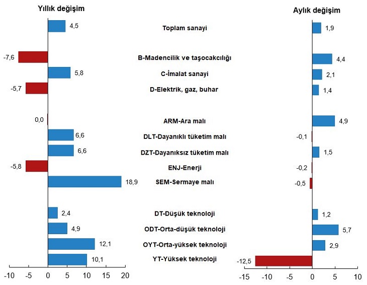 Sanayinin alt sektörleri incelendiğinde, 2023 yılı Ocak ayında madencilik ve taşocakçılığı sektörü endeksi bir önceki aya göre %4,4 ve imalat sanayi sektörü endeksi %2,1 ve elektrik, gaz, buhar ve iklimlendirme üretimi ve dağıtımı sektörü endeksi %1,4 arttı.