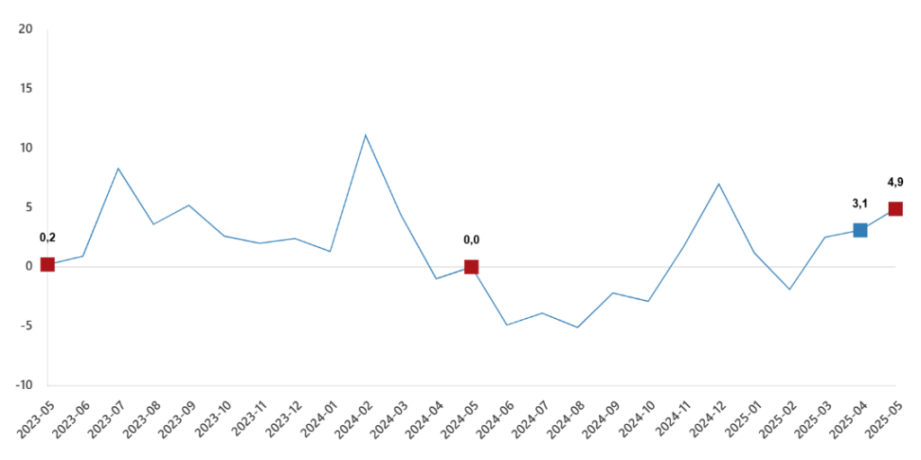 Türkiye İstatistik Kurumu (TÜİK) Mayıs ayı itibarıyla Sanayi Üretim Endeksi verilerini açıkladı. Buna göre, sanayi üretimi yıllık yüzde 4.9 arttı.