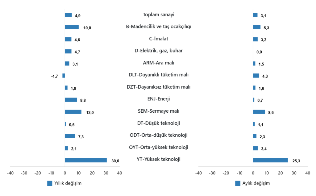 Sanayinin alt sektörleri (2021=100 referans yıllı) incelendiğinde, 2025 yılı Mayıs ayında madencilik ve taş ocakçılığı sektörü endeksi bir önceki yılın aynı ayına göre %10,0 arttı, imalat sanayi sektörü endeksi %4,6 arttı ve elektrik, gaz, buhar ve iklimlendirme üretimi ve dağıtımı sektörü endeksi %4,7 arttı.