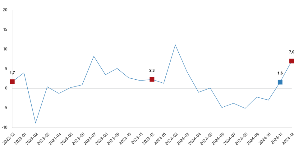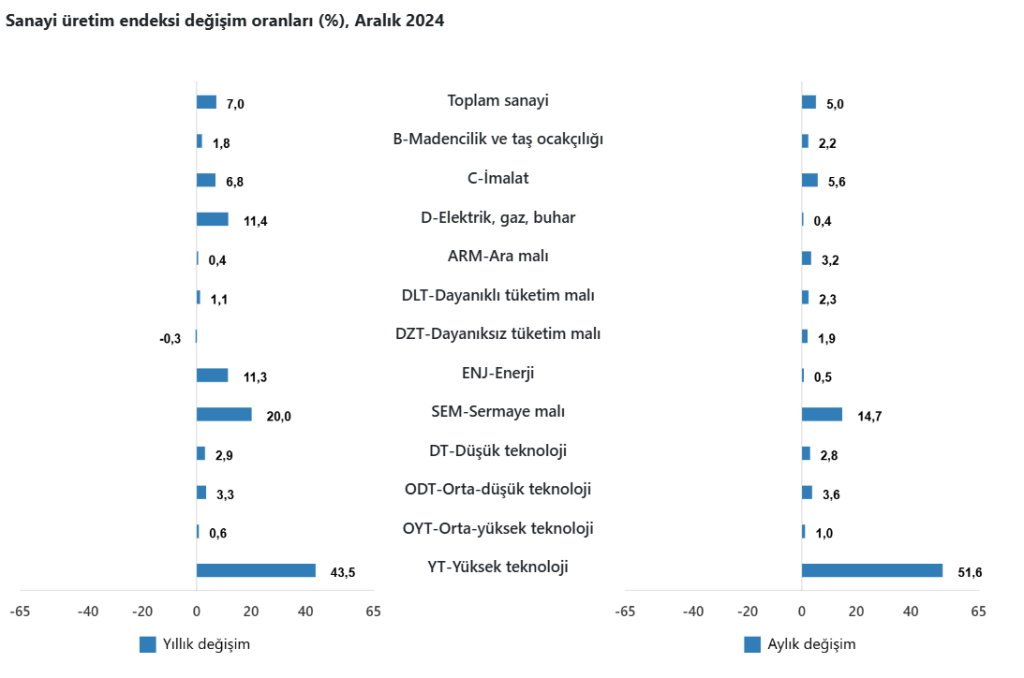 Türkiye İstatistik Kurumu (TÜİK) Aralık 2024 itibarıyla Sanayi Üretim Endeksi verilerini açıkladı. Buna göre, sanayi üretimindeki yıllık artış yüzde 7.0 oldu.